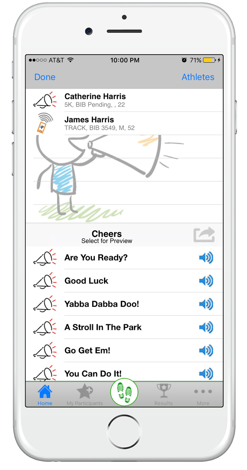 Cheers: You can review and replay any sent or received cheers. Cheers can be sent before, during or after the event. You can choose from pre-recorded audio cheers or sent personalized Text-to-Cheer messages.